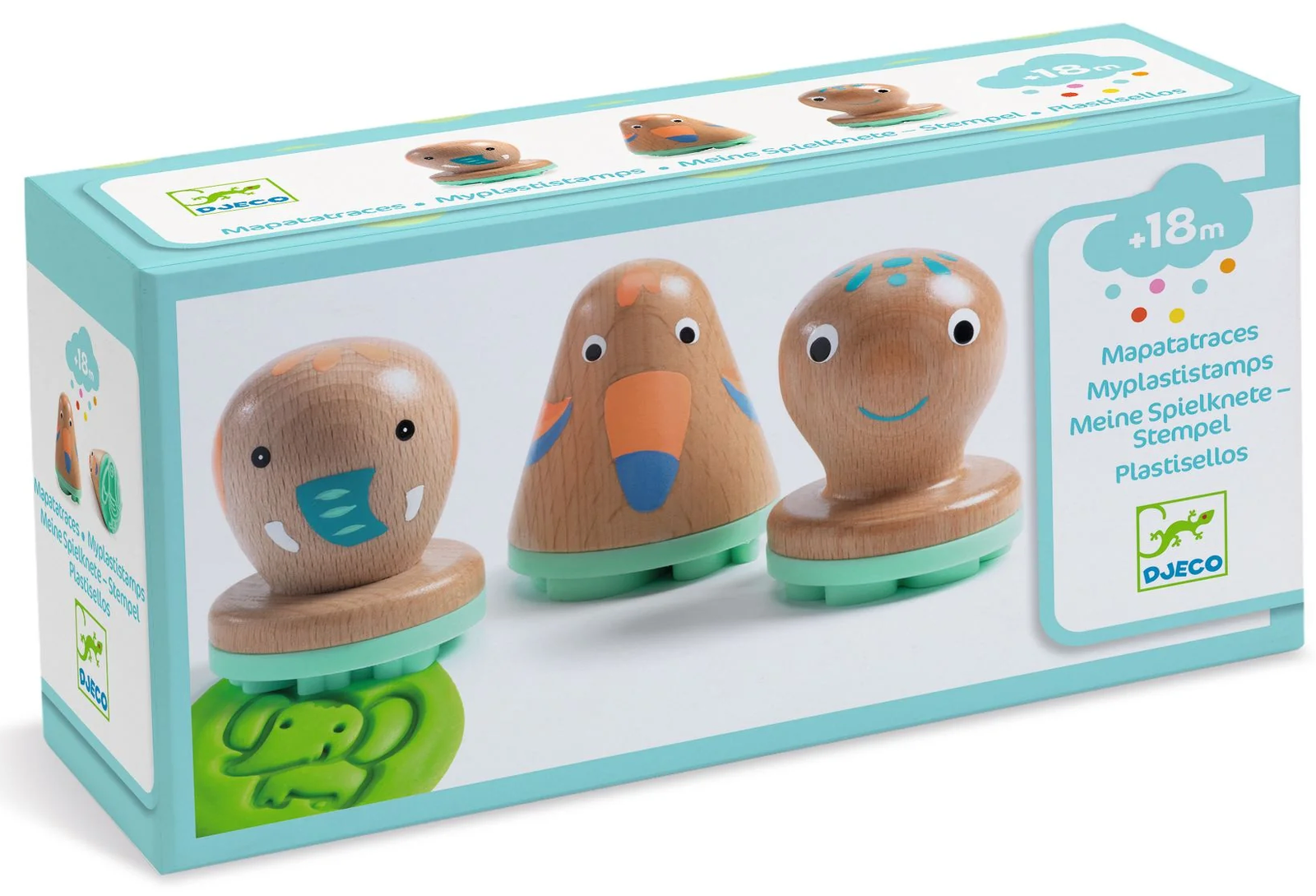 Three adorable wooden "animal" stamps that are designed to draw the animal in the dough. Features an ergonomic design with handles that are specially adapted to small hands. Handicraft activity for developing dexterity, creativity and open-ended play.