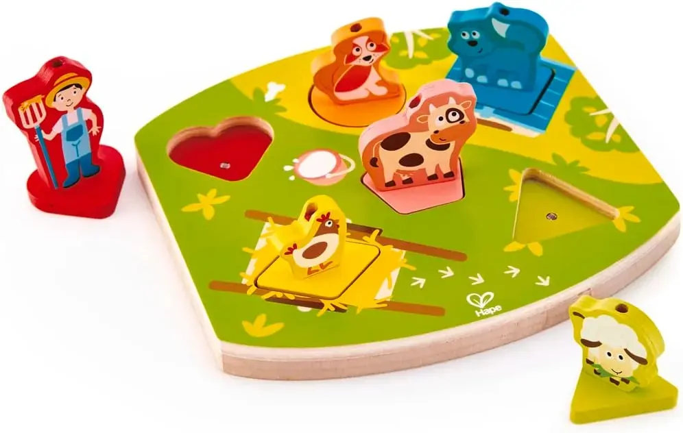 Solve the Farmyard Sound Puzzle by matching the farm animal pieces by colour, shape and sound, and create your own farmyard story as you play! Made from wood.