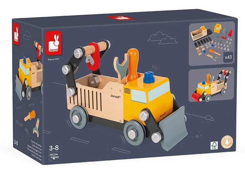 Attention all budding builders! With this build-it-yourself wooden truck, youll be fully equipped to handle the toughest, craziest construction projects! This 2-in-1 toy combines the challenge of building a fabulous builders truck using the nuts, bolts and screws provided with the joy of coming up with all sorts of adventures for the new truck to appear in! Once its built, your beautiful truck with its natural wood body and yellow paint will be ready to help kids aged 3 and over with the most complex building work! This 43-piece set includes 2 tools for assembling the vehicle and full assembly instructions. The lorry is made of FSC-certified wood from sustainably managed forests.