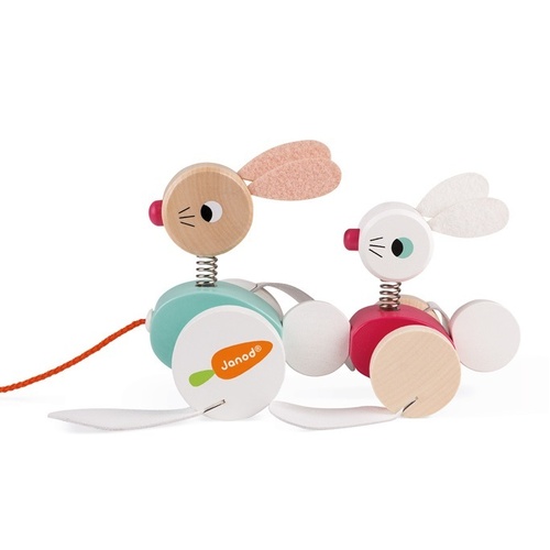 This rabbit family will follow you everywhere, flapping their feet as fast as you can go! Made from beech and cherry wood, Zigolos Pull Along Rabbits are a superb early learning toy that will help develop your childs motor skills and be great companions on many adventures!