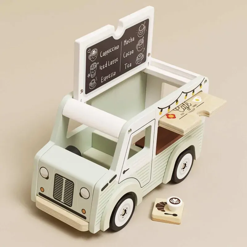 Introduce your little ones to the world of imaginative play with the Wooden Cafe Van, a beautifully crafted toy made from FSC-certified wood. This vintage-style caf van is painted in a delightful pistachio green and white, adorned with intricate artwork on all sides, making it a charming addition to any playtime scenario.