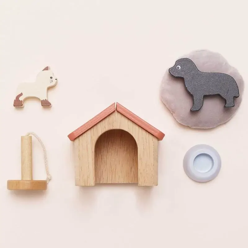 A wonderful wooden pet set including a dog, a kennel, a dog bed, a cat, a cat scratcher and a food bowl. A sweet and adorable set for animal lovers.