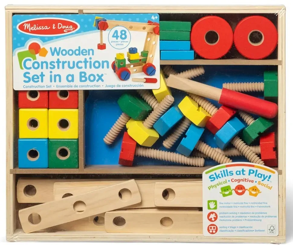 With 48 wooden pieces (including nuts, bolts, drilled bars to connect, and a child-size screwdriver), this classic building set gives kids all they need to tinker and build! Printed right on the sturdy storage box are building plans for a crane, motorcycle, airplane, and race car to get the fun started. With some imagination and a few creative twists and turns, kids can make hundreds more amazing structures too! Any time kids play with this durable set, they'll be building fine motor skills, problem-solving skills, and hand-eye coordination. Included extension activities guide parents to educational activities that also build early maths skills.