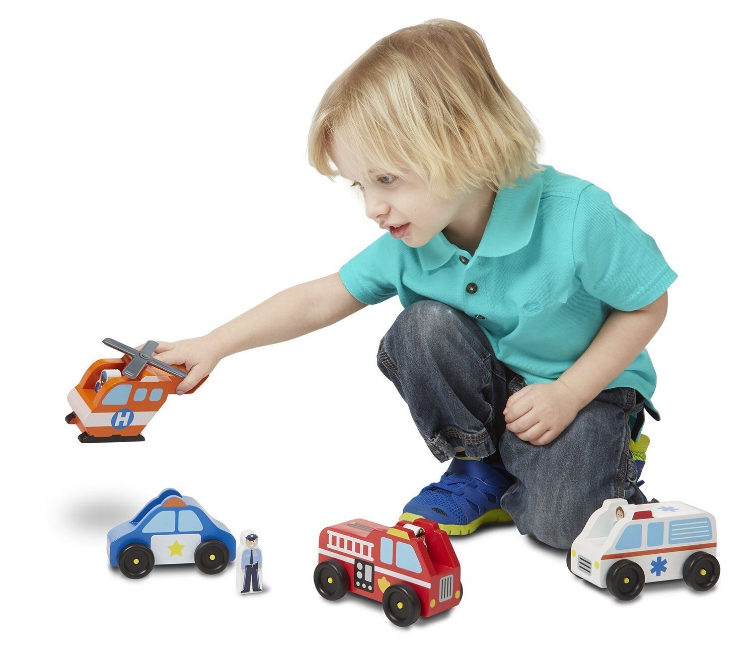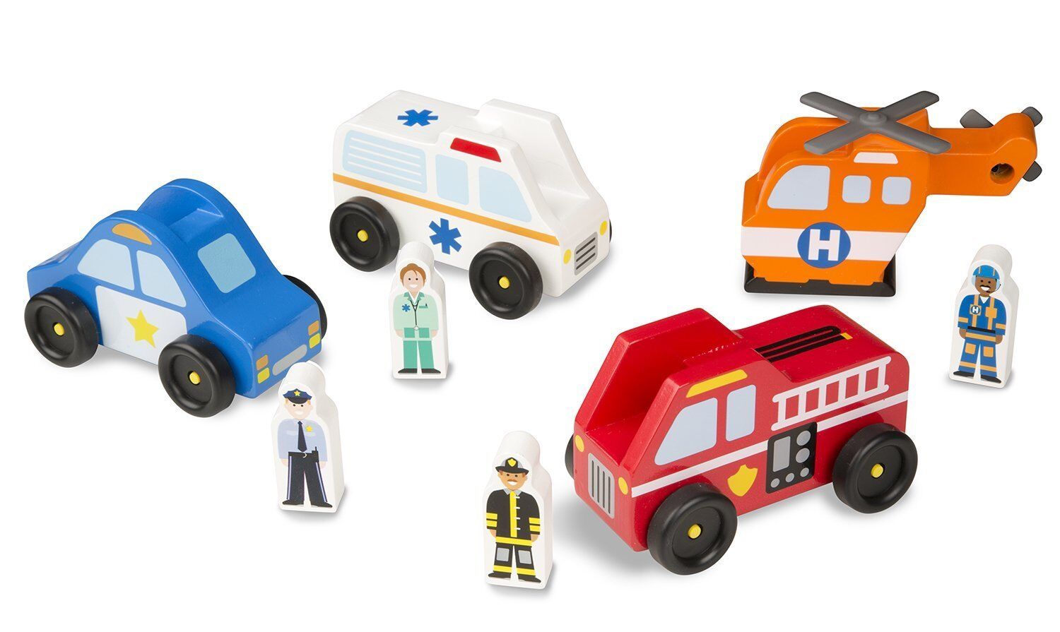 Race to the rescue with this collection of four wooden emergency vehicles! Sturdy wooden construction and moving parts on each vehicle means the ambulance, rescue helicopter, police car, and fire engine will stand up to endless of hours of constructive play. Wooden emergency worker play figures fit into each of the vehicles and can also be removed for additional imaginative play opportunities.