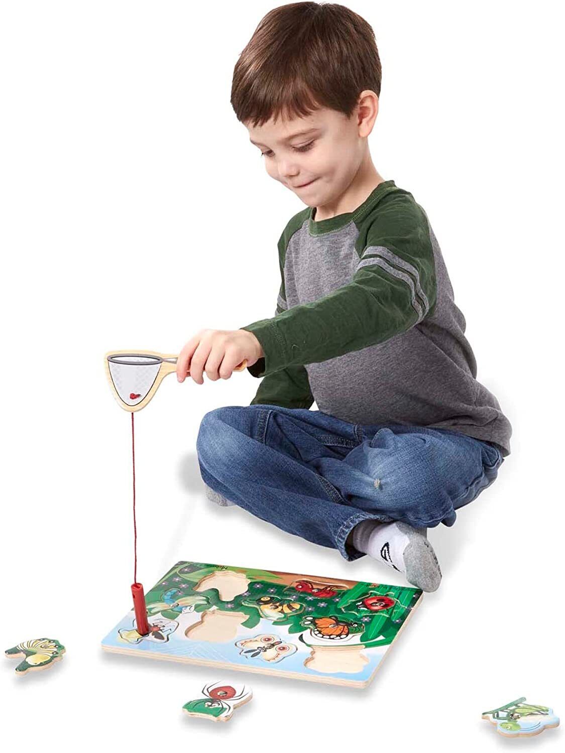 This magnetic wooden puzzle game features bugs and insects in a garden. Use the magnetic butterfly net to capture the ten, bug buddies from the game board. Then, enjoy the challenge of returning them to their preferred perch! A creative way to encourage eye-hand and fine motor development.