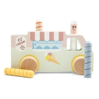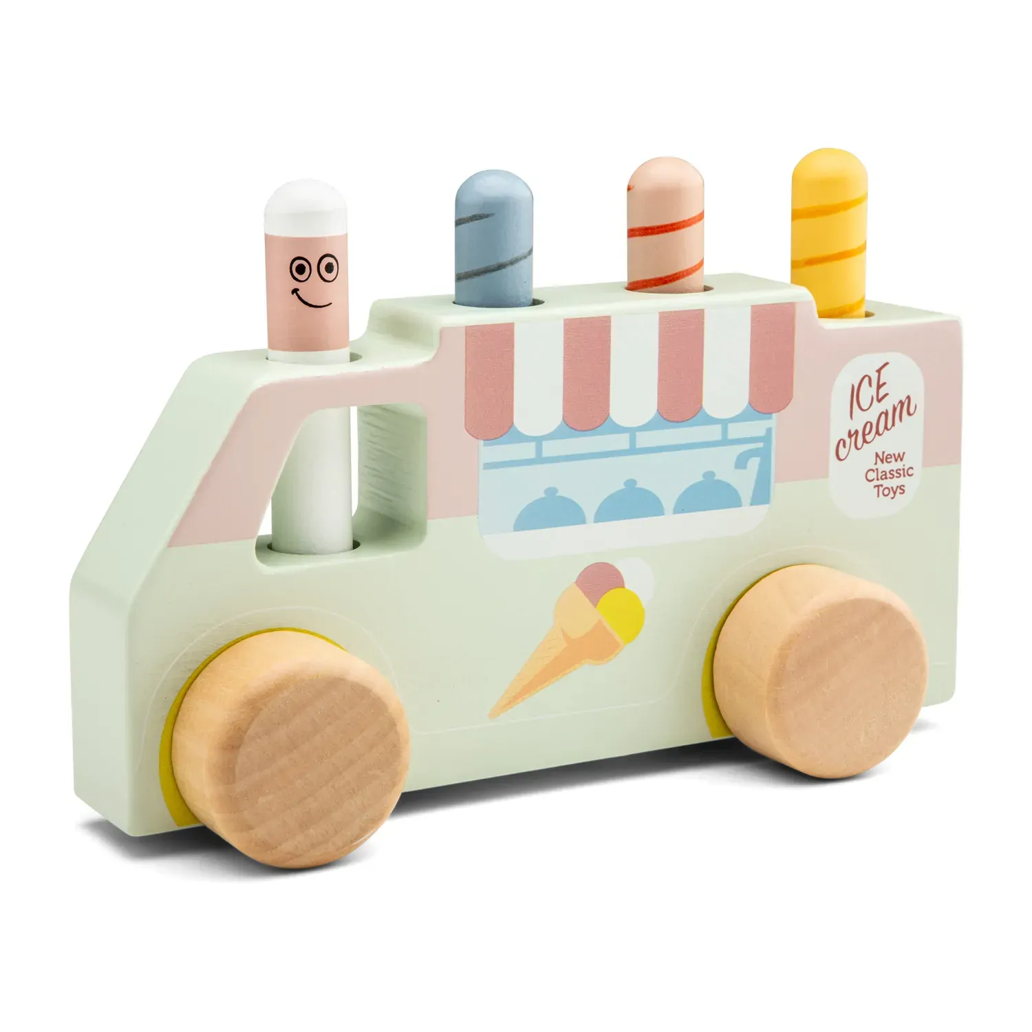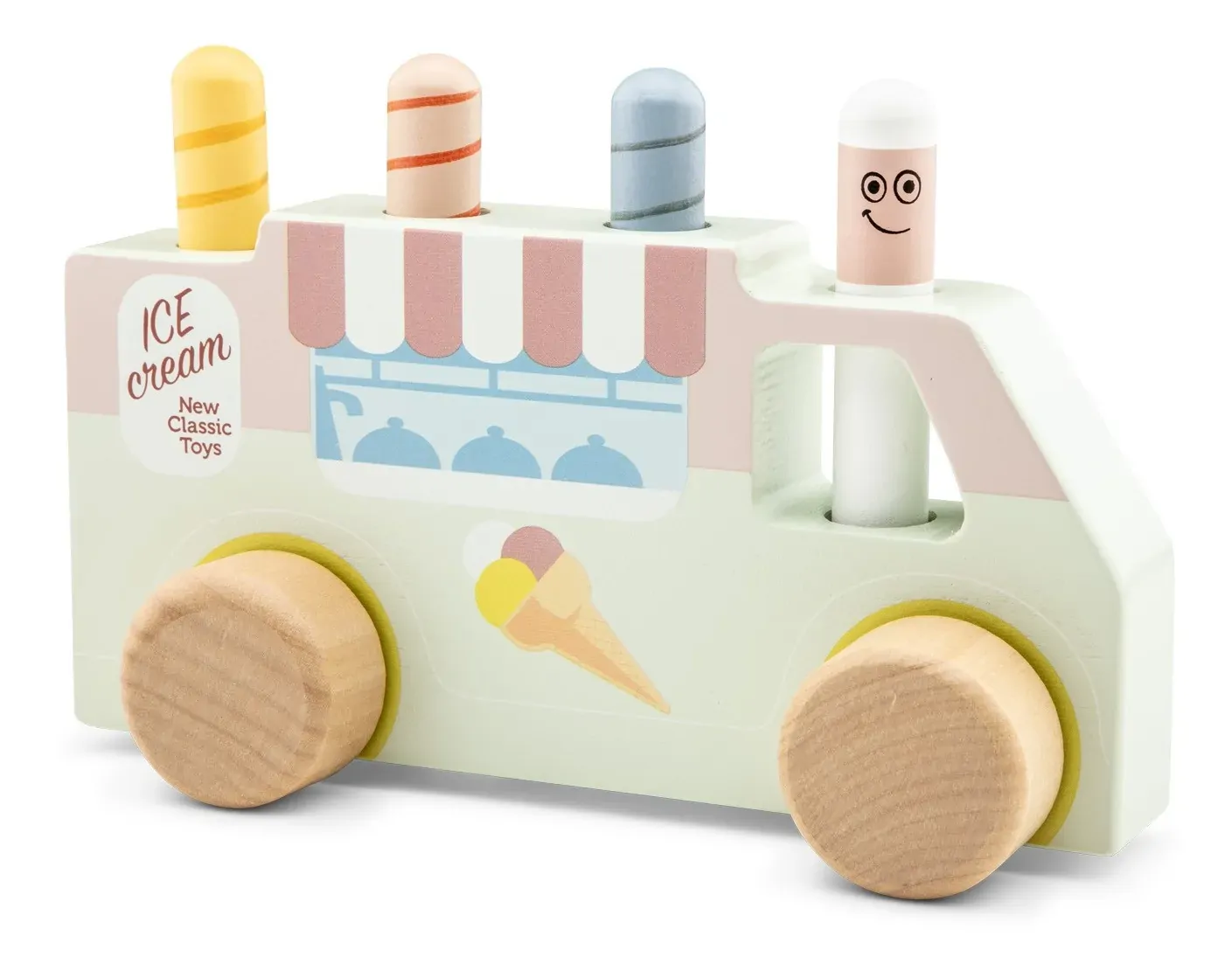 Push, pop and play! This wooden pop-up ice cream truck from New Classic Toys is spring-loaded and ready for fun! Press the figures down, watch them pop right back up and try to catch them as they soar into the air it's a fun game that keeps little minds active and entertained.