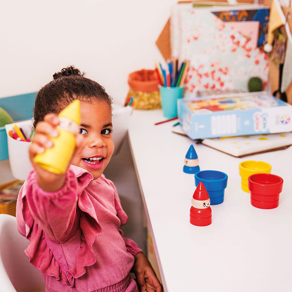 Place the gnomes where they belong! 3 gnomes have set up their home in your garden! Can you discover where they are hiding? Try to recreate the image in one of the 48 challenges. This wooden preschool matching game helps develop logic and deduction skills through stacking, counting, hiding, and just playing with the gnomes!