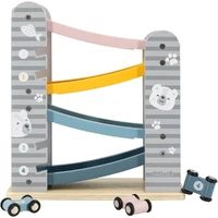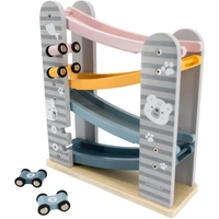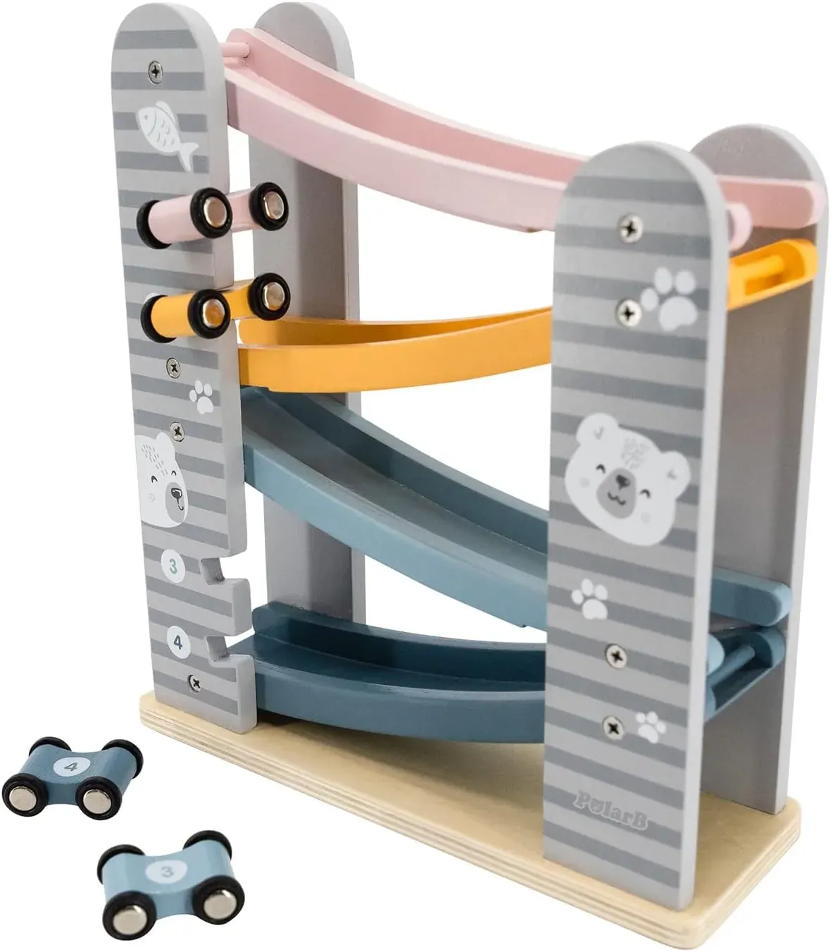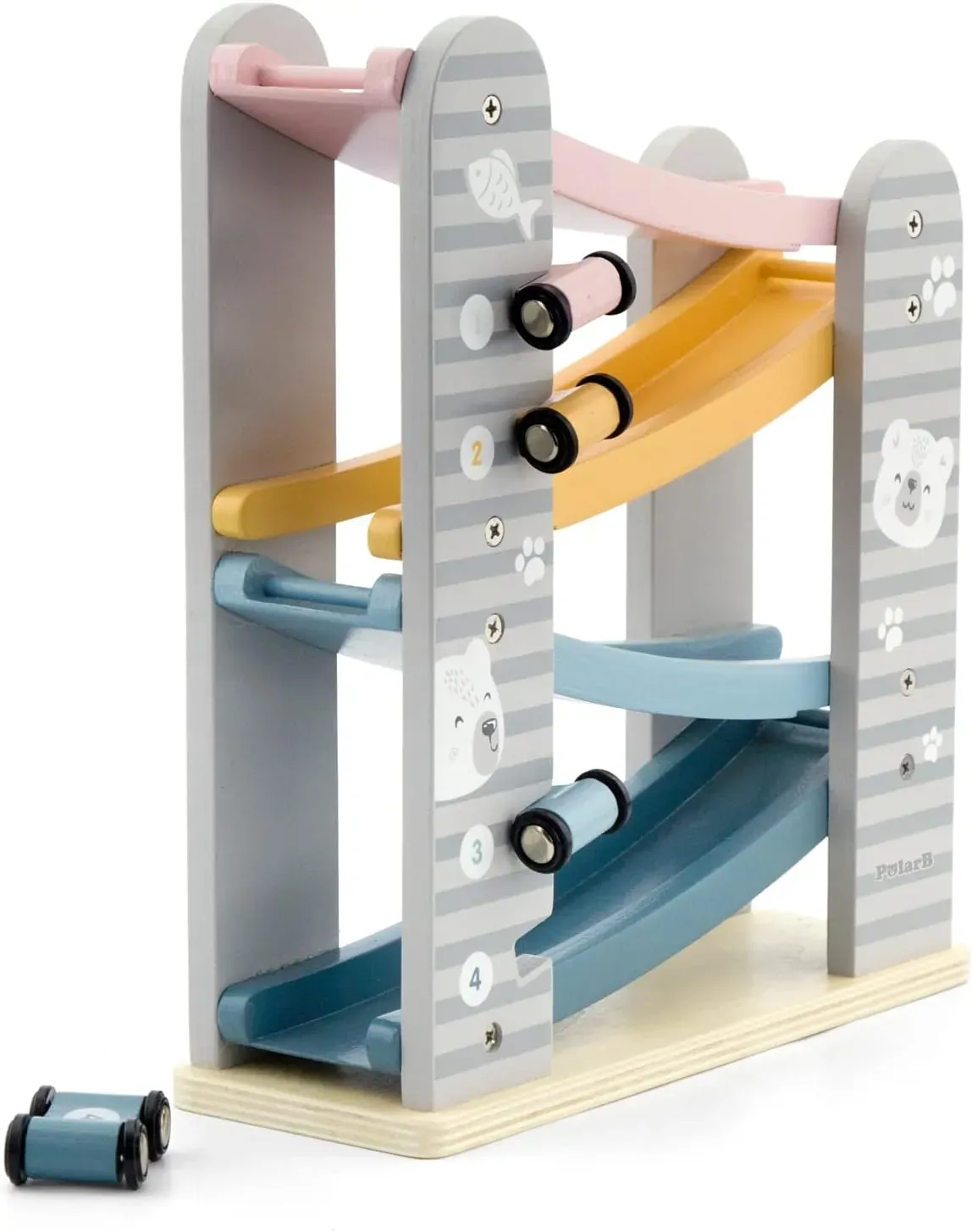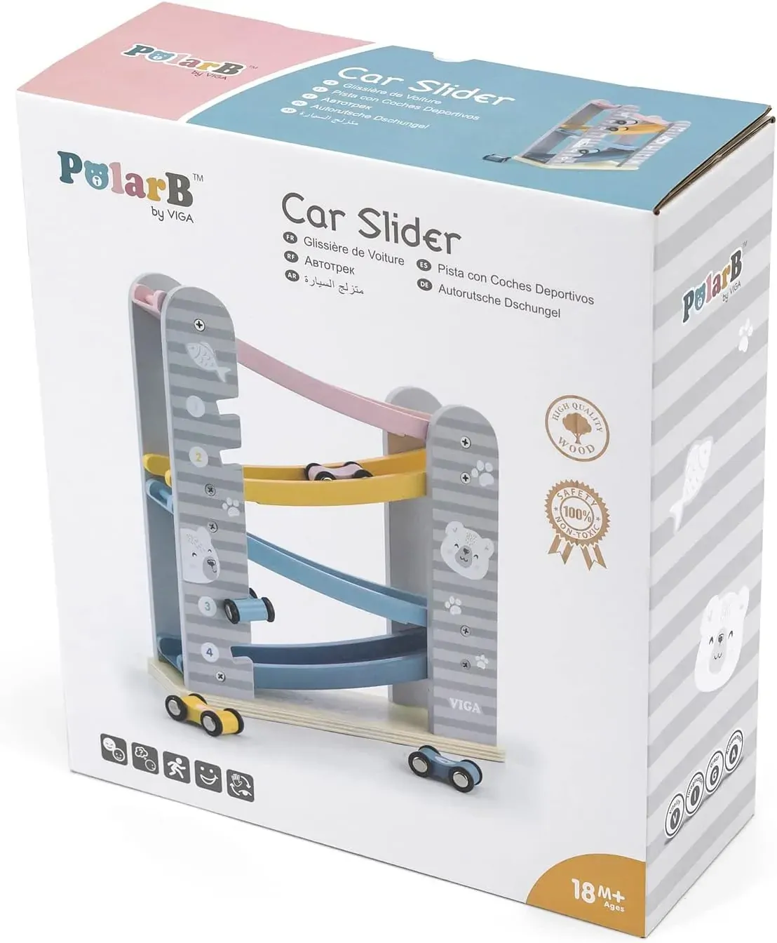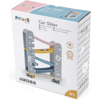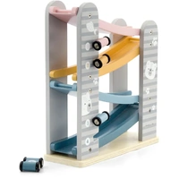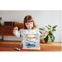 A car slider that comes with 4 mini cars printed with numbers. Additional slots on the side are specially designed to park the cars and avoid them being lost easily.